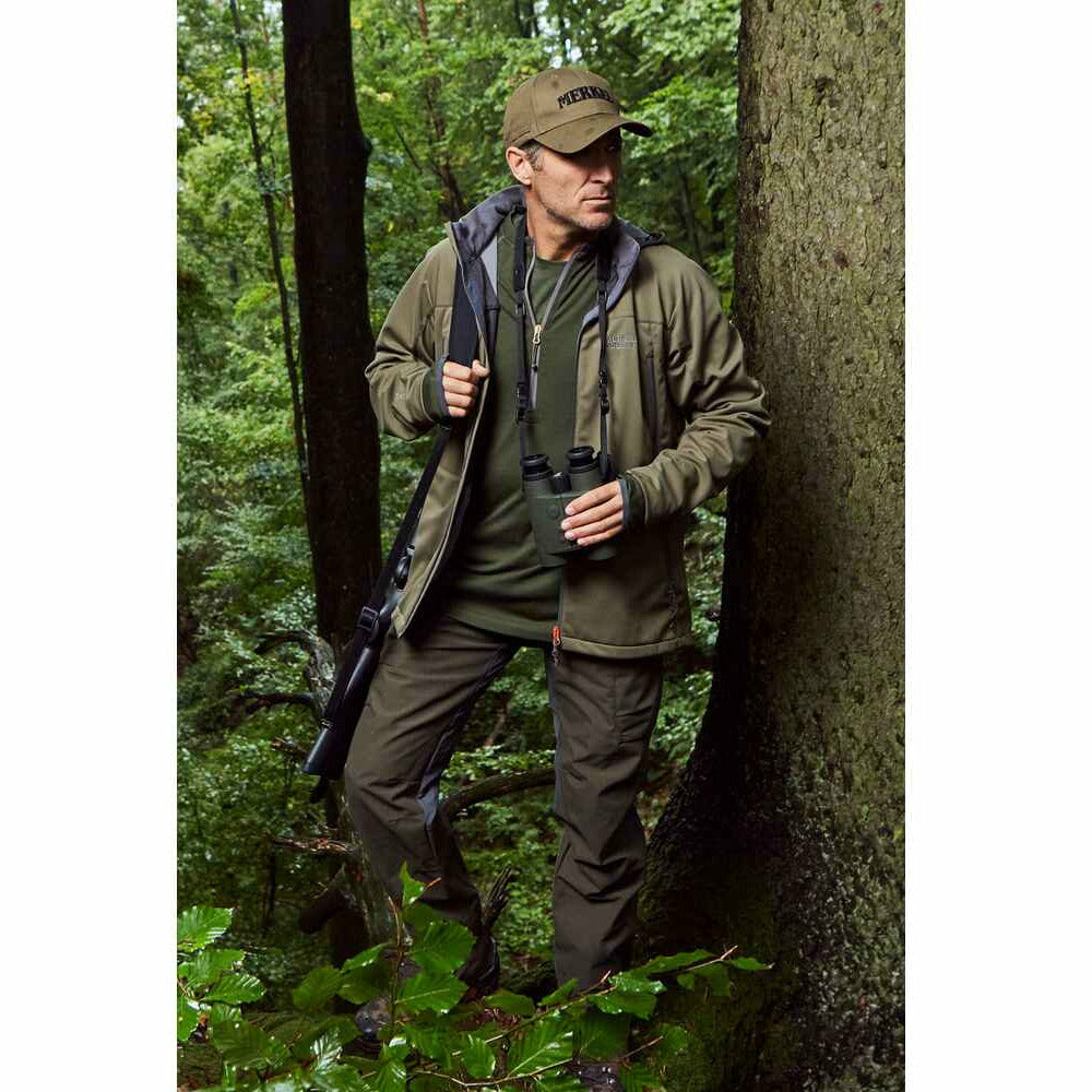 The Palaearctic HYBRID trousers are designed for active hunting in almost any weather in medium to cold temperatures. Thanks to 25cm long, strong ventilation zips, the „HYBRID trousers“ can also be worn well during summer hunts and mountain hunting on warm autumn days. The special feature of these trousers is the unique combination of 100% waterproof (thermally sealed seams) sections (front area to the cargo pockets, rear area to just below the back of the knees and the entire seat), and strong, highly breathable 4-way stretch sections for maximum freedom of movement. This way, you are protected against moisture in high grasses, but thanks to the stretch sections you’ll feel very comfortable and thus can remain concentrated. Pure hard-shell jackets and trousers usually make you sweat most of the year due to the lack of temperature difference with the outside surroundings. It does not matter which membrane is used, as each membrane requires a temperature difference of around 15C° in order to work properly. With the MerkelGEAR HYBRID trousers, however, excess heat can escape at the level of the nylon stretch and via the long ventilation zips. The 3.5 layer laminate (37.5™ membrane, 20.000mm / 20.000g/m²) built into the waterproof parts has a low-noise, slightly roughened surface. In an extensive test phase, this fabric has also proven to be extremely robust. The inside of these waterproof parts is finished with soft jersey, which does not absorb water and thus remains dry and warm. The seat of the MerkelGEAR HYBRID trousers is made of the ultra-strong and waterproof Oxford fabric (37.5™ membrane, 20.000mm / 20.000g/m²), already known from the MNTN and the WNTR trousers. The stretch sections above the front waterproof facings and at the level of the back of the knees are made from highly breathable, 2-way stretch and very durable 4-way stretch nylon fabric. An improved DWR finish (PFOS- & PFOA-free) lets water run off easily and if the stretch fabric does get wet it will dry very quickly. The HYBRID trousers are, in our opinion, the ultimate pair of trousers if you are looking for a well-made and highly reliable all-rounder for hunting in Central Europe! A variety of functional details together with the further improved MaxComfort waistband system, a modern fit and innovative integral seams on the cargo pockets result in a pair of trousers that is second to none: lengthened kidney protection in the back, strong belt loops, non-slip stretch waistband with 1.5cm wide silicone coating. With integrated, soft hooks for the optionally available braces. Two loop buttons at the front keep the trousers 100% closed. 1 back pocket with zip. 2 deep pockets made of ultra-soft fleece, 2 cargo pockets with integral seams (water can run off + pocket is inseparably sewn into outer fabric). One with a silent zip and integrated smartphone pocket, the other with the removable MerkelGEAR cartridge patch. The right cargo pocket also has a generous knife pocket. Silent (without metal parts) YYK ventilation zips size #5. Triple preformed knees. Outwardly fashioned seams at the hem (shark fin shape for the use of crampons). Silently adjustable leg cuffs. A strong shoe hook which, when not in use, disappears in a textile loop to e.g. not to press in rubber boots, can be anchored to mountain boots. Thus, the trouser legs are prevented from „riding up“. Strong double or triple-stitched seams made of heavy-duty yarn guarantee a long durability of the Palaearctic HYBRID trousers. A generous gusset in the crotch sustainably relieves the crotch seams.