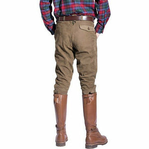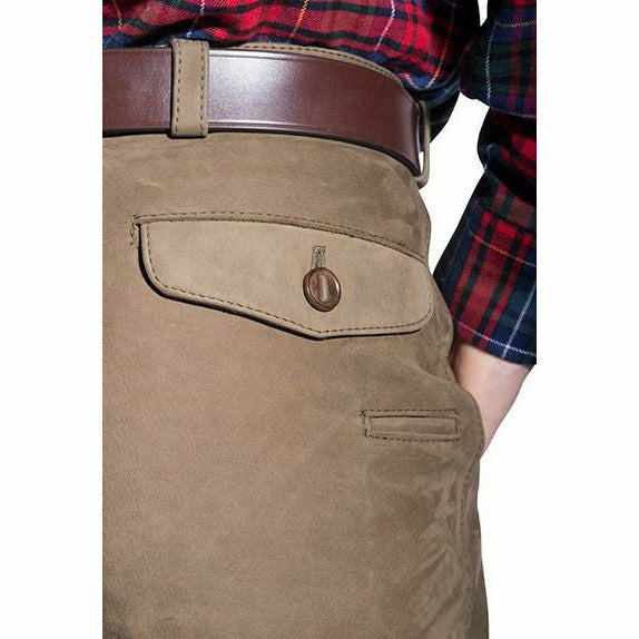 Hållbara jakt "knickers" av robust läder. Tillverkad av det bästa lädret, bearbetat med en kornig utsida. Dessa "Lederhosen" har bälteshällor och knappar för användning med traditionella hängslen. Byxorna har en bakficka med lock och en mindre knivficka på sidan.