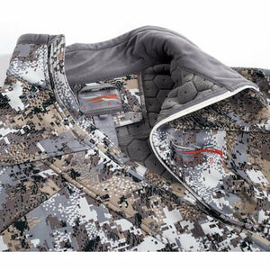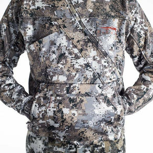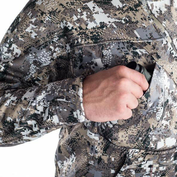 Sitka Gears revolutionary diagonal full-zip to allow a cozy hand muff, the Fanatic Lite is a silent, fully featured tool for mid-season sits. The durable high-gauge face fabric is bonded to an air-permeable honeycomb jacquard Micro-Fleece to allow breathability and remarkable noise reduction. A front storage pocket, rangefinder pocket with tie-off and safety harness pass-through port keep you and your necessities comfortably in place.