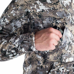 Articulated patterning eliminates bulk and frees you up to move, bend, twist and draw. The full-length diagonal zipper pulls the jacket close, while the built-in insulated hand muff keeps your digits toasty and your arms in a relaxed position. Strategically placed pockets make for easy access to your rangefinder and grunt tube, and the safety harness pass-through port keeps your attachment point comfortably in place.