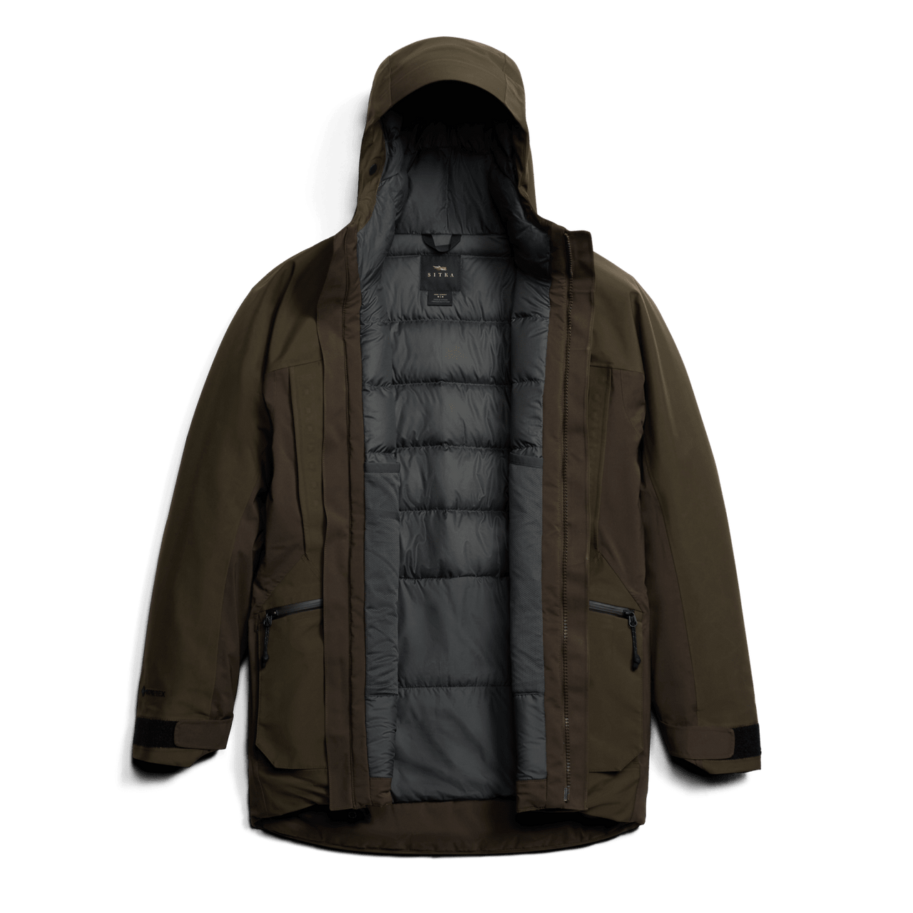 Sitka Gear's apex of warmth, weather protection and durability from marsh to mountain top. The 100% waterproof, breathable GORE-TEX fabric and body-mapped PrimaLoft® down and synthetic insulation blends subdue torrential rain, howling winds and frigid temperatures with ease. Protection provided by a 75-denier ripstop face fabric ensures lasting durability when hunkering down in jagged glassing spots or frozen crop stubble. Magnetic high hand pockets offer complete coverage and comfort between calling runs or sits behind a spotter. The Blizzard Pro Parka features a fully adjustable hood that keeps wind and water out, without obstruction your peripherals. Own the elements with this powerhouse of winter-weather protection.