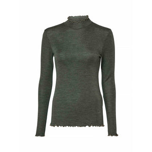 Haven Longsleeve Wool Top Women är mjuk finstickad tröja med en turtleneck-krage, tillverkad i en extra fin merinoull och lyocellblandning. Överkanten på kragen, ärmsluten och fållen är sydda med en tät brodyrsöm som gör att kanten blir feminint och dekorativt krusad. En bekväm tröja med snygga detaljer som gör sig bra under en rundhalsad tröja eller skjutväst i stället för en blus eller skjorta. Fungerar också utmärkt som ett första lager när det blir kallare temperaturer.