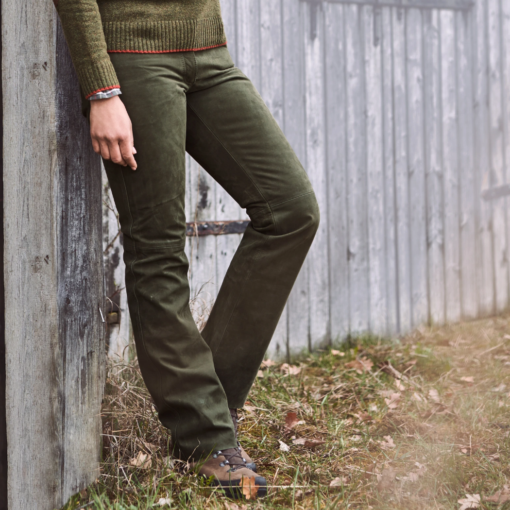 Natural buffalo leather is extremely robust and has a powerful optic, is noticeably smooth when worn. These trousers are ideal for hunting and leisure, thereby not losing any of its reliability every after a period of many years. Normal fit, angled side pockets, leg pocket with knife compartment.