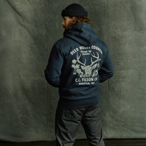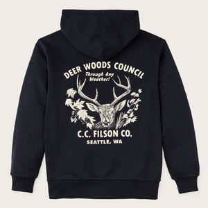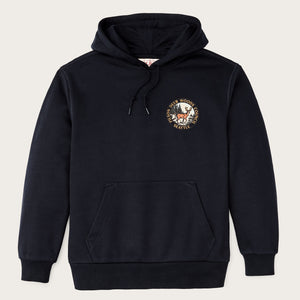 Made with durable 75% cotton blended with 25% polyester for strength. The interior is lofted for for warmth and the smooth exterior surface resists pilling. The hem and cuffs are built with a wide and sturdy rib-knit for a custom fit with outstanding stretch and recovery. The lorge hood easily fits over a ball cap and is drawcord-adjustable for security. Finished with a front kangaroo pocket and custom graphics.