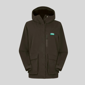 The 2-layer fabric features a brushed polyester outer laminated to a technical waterproof/breathable membrane with a loose polyester tricot lining.